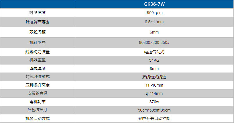 GK36-7W全自動雙針四線全自動封包機采用雙機針縫合,一次縫兩趟線,牢固可靠,可實現(xiàn)無泄漏封包,適合于對縫口有嚴格要求的廠家對紙袋、塑編袋、布袋等的封包縫口。采用 光電開關(guān)自動控制啟停機、電控氣動式切刀自動剪切線辮,適合于自動化程度較高的化工廠、倉庫、碼頭等流水線縫包。